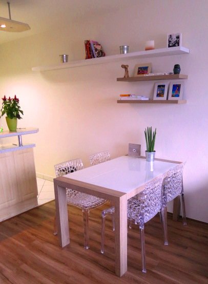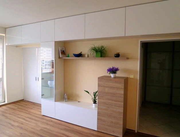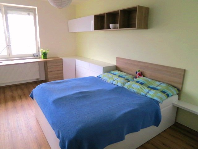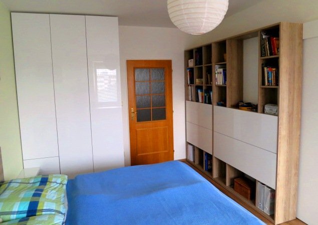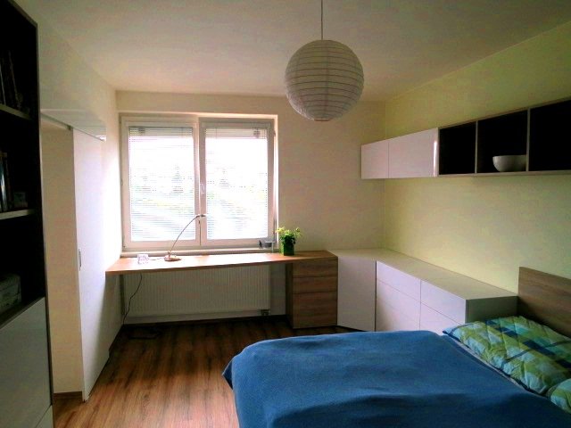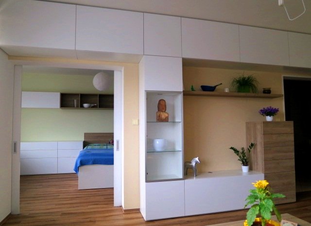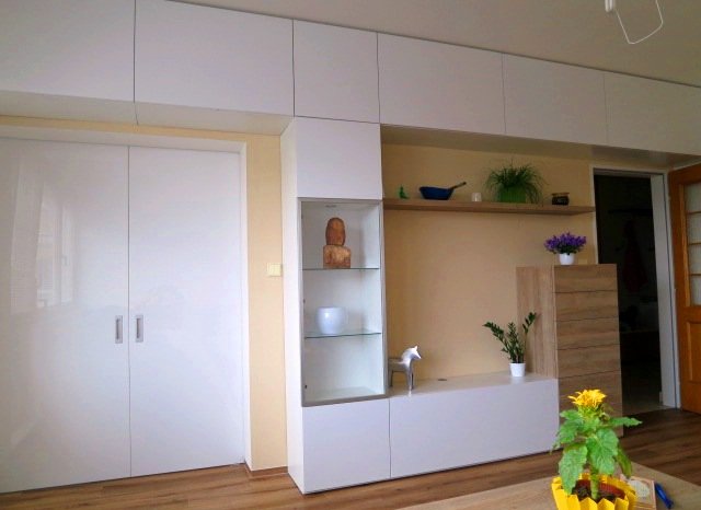 Dodávka nábytku: jídelní stůl, židle, obývací stěna s úložnými prostory, posuvné dveře, komody, pracovní stůl, knihovna, skříň, lůžko, matrace, rošty